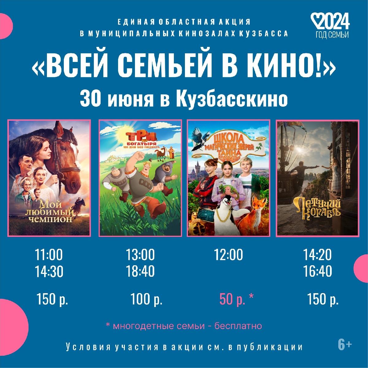 Всей семьей в кино! Семейные кинопоказы по специальной цене в Кузбасскино 30 июня!