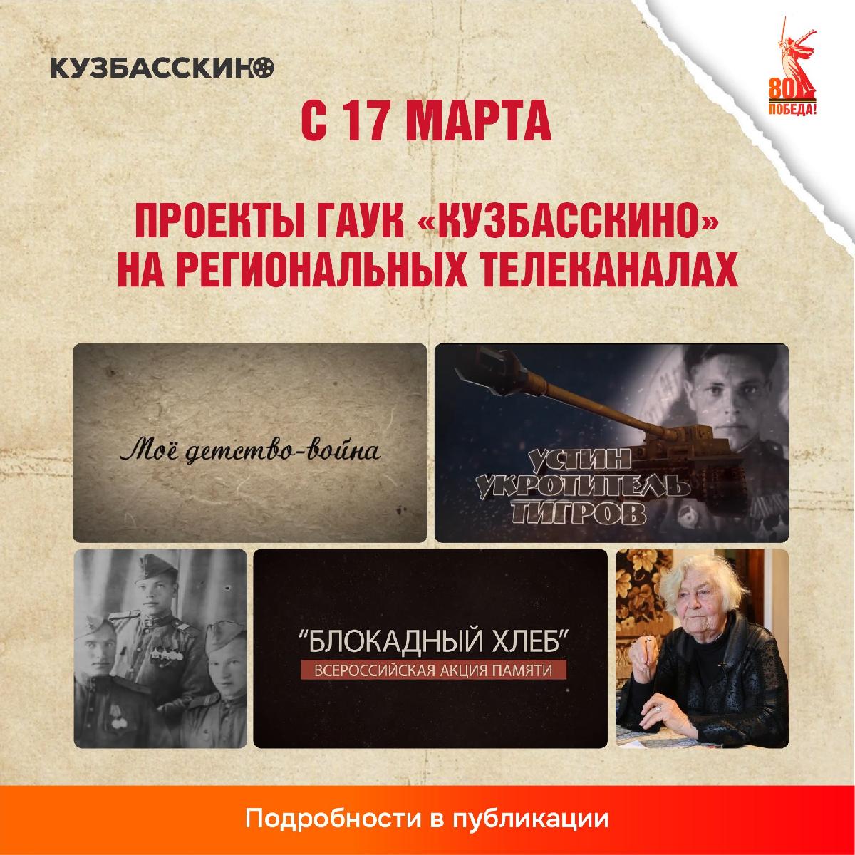 На региональных телеканалах зрители могут увидеть серию фильмов, созданных сотрудниками ГАУК «Кузбасскино»: «Мое детство – война», «Блокадный хлеб» и «Устин – укротитель тигров».