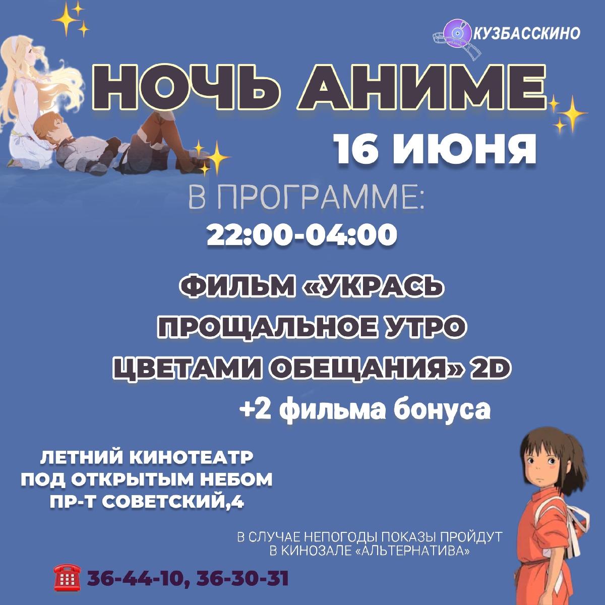 16 июня в 22:00 начнется нон-стоп показ в летнем кинотеатре ГАУК «Кузбасскино», в программу которого войдут три фильма в жанре аниме.