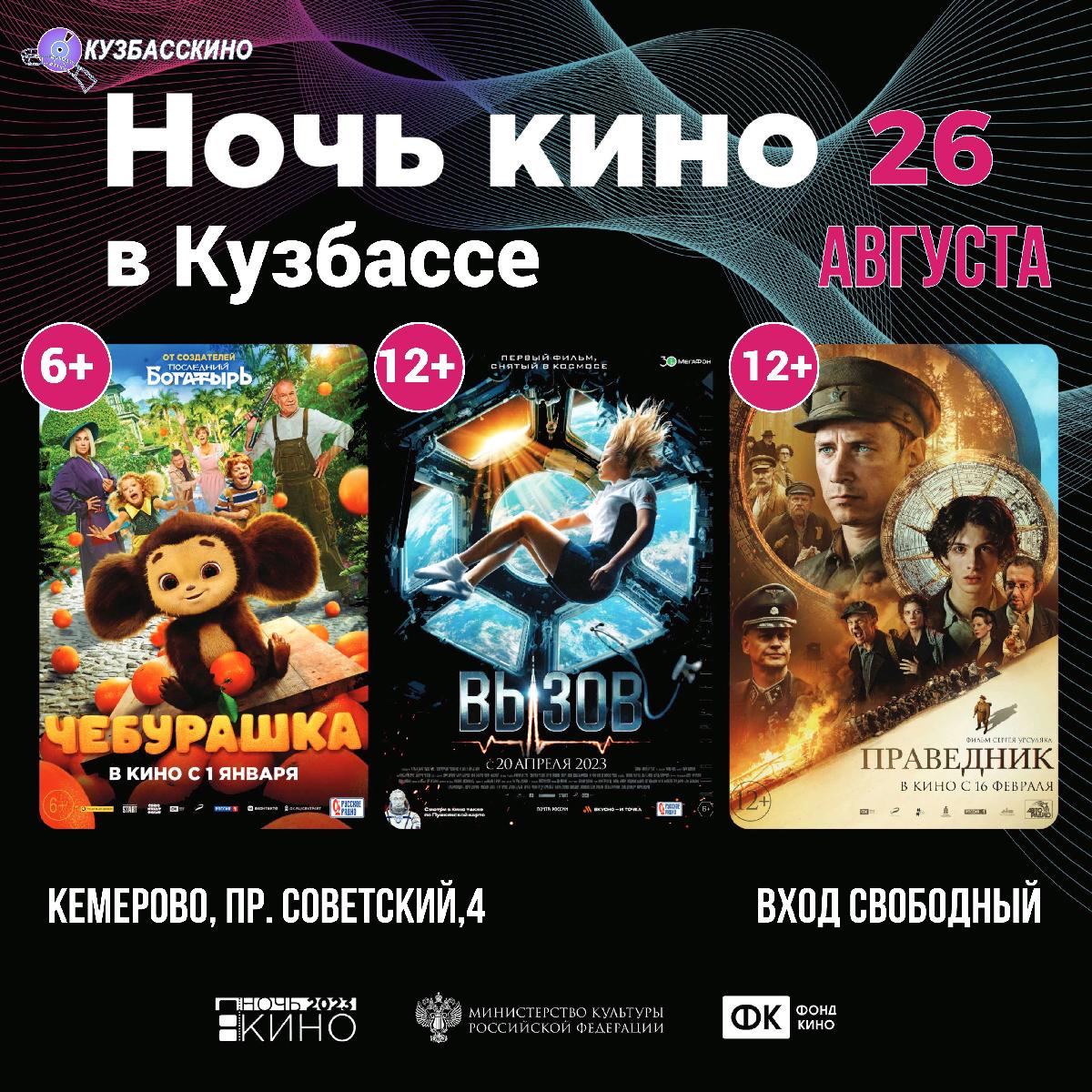 26 августа 2023 года в Кемеровской области на 94 площадках пройдут бесплатные показы самых кассовых российских картин 2023 года: «Чебурашка» (режиссёр Дмитрий Дьяченко, 6+), «Вызов» (режиссёр Клим Шипенко, 12+) и «Праведник» (режиссёр Сергей Урсуляк, 12+).