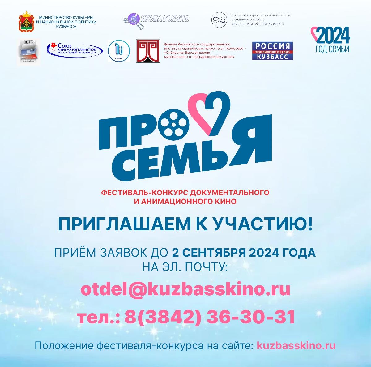 23 января 2024г. в Кузбассе стартует областной фестиваль-конкурс документального кино и анимации «ПроСемьЯ», посвященный Году семьи. Областной фестиваль-конкурс документального и анимационного кино для профессионалов и любителей киноискусства «ПроКузбасс» стал традиционным в Кузбассе. Авторский интерес к региональному фестивалю неуклонно растет. «ПроКузбасс» (2020), «ПроСпорт» (2021), «ПроНаследие» (2022), «ПроГероев» (2023), – 160 фильмов за 4 года стали документальным достоянием исторического, спортивного и культурного Кузбасса.