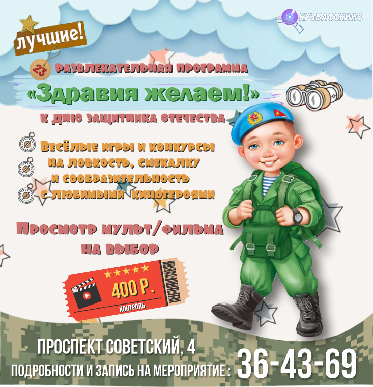 С 19 по 29 февраля, в преддверии праздника, Дня защитника Отечества, кинозал «Кузбасскино» приглашает школьников и студентов посетить праздничную программу «Здравия желаем!».