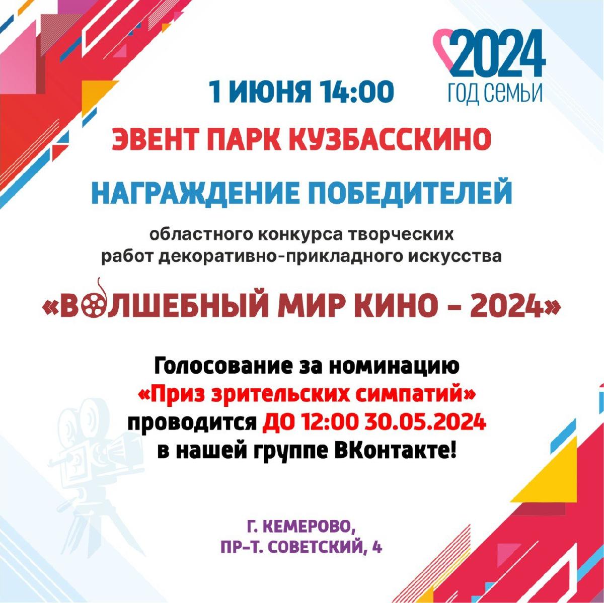 1 июня в 14:00 в ГАУК «Кузбасскино» состоится церемония награждения победителей областного конкурса творческих работ «Волшебный мир кино-2024» в рамках Года семьи. Конкурс проводится ежегодно и направлен на развитие интереса кузбассовцев к кинонаследию России.
