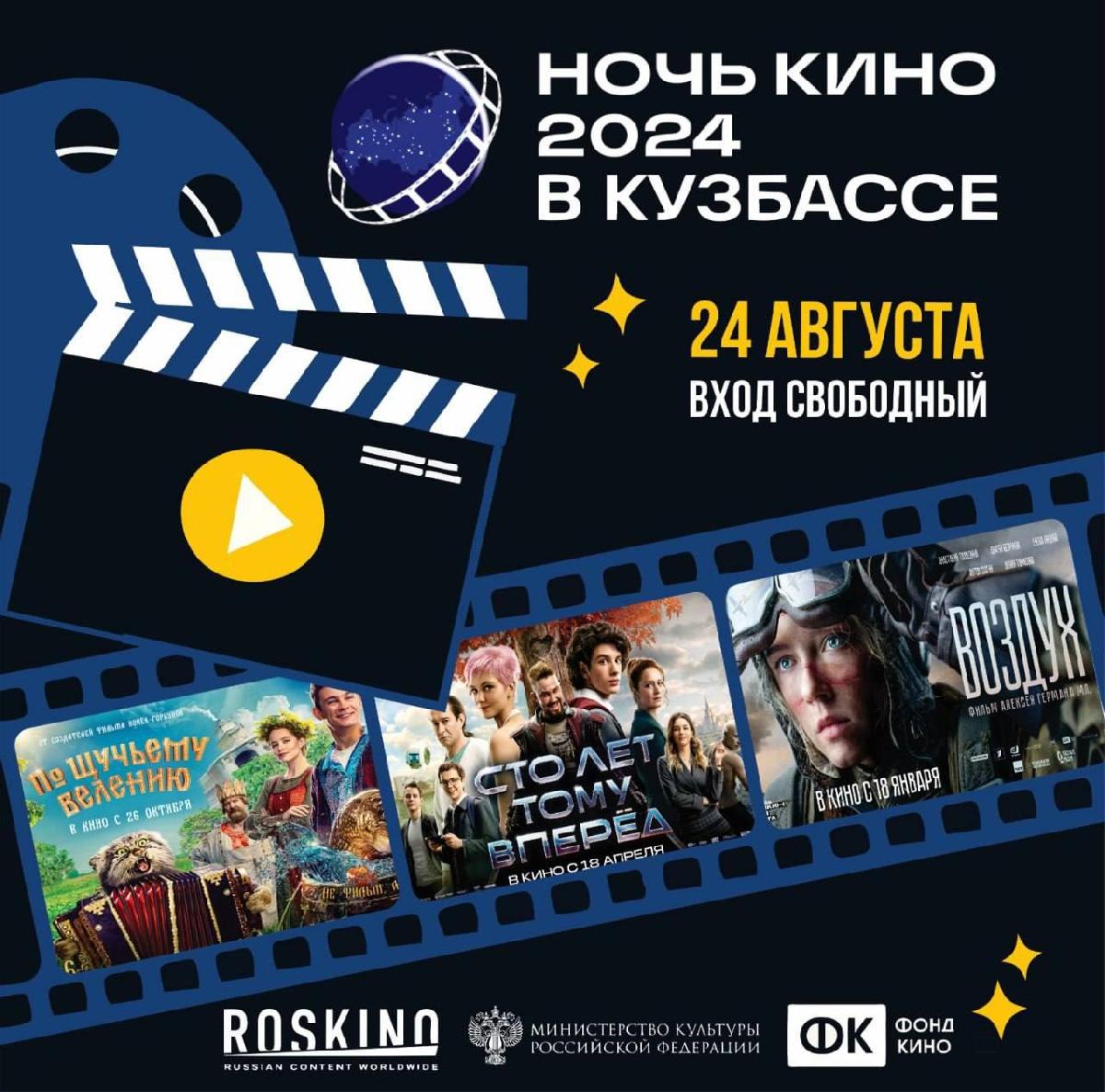 Показы «Ночи кино» в Кузбассе начнутся 24 августа и продолжатся в ночь с 24 на 25 августа на 116 площадках: в муниципальных кинозалах, культурных и досуговых центрах, музеях, библиотеках и парках.