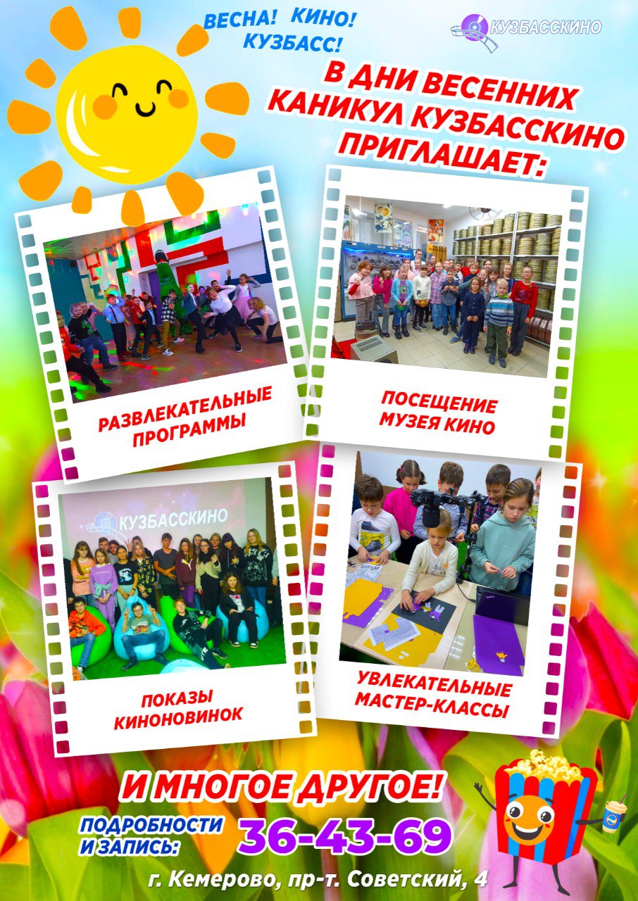 Кузбасскино подготовили динамичную и яркую программу на весенние каникулы: «Весна! Кино! Кузбасс!»! Для участников программы подготовлены баттлы по фильмам и мультфильмам, занимательные викторины по сказкам и персонажам, необычные задания на знание современного кино. Встреча с любимыми персонажами! Оригинальная, киношная фотозона и конечно просмотр фильма!